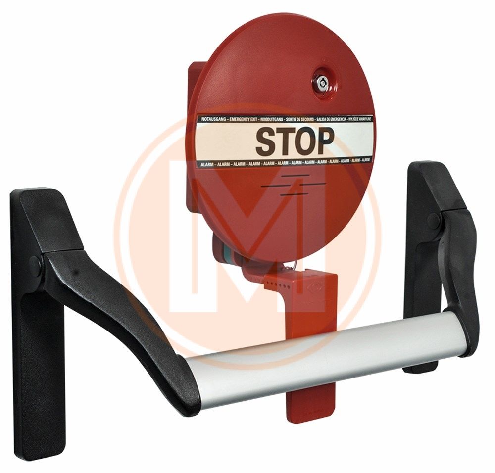 Voorkom eenvoudig oneigenlijk gebruik van paniekbeslag op vluchtdeuren met nooduitgang beveiliging. Het systeem is bedrijfsklaar en kan direct op het lichtnet worden aangesloten. Bij gebruik van de vluchtdeur, treedt een alarm (100dB/1m) en flitslichts in werking. Bevoegde personen kunnen de deur simpel met de systeemsleutel passeren, zonder alarm. Een tekstbord ”Nooduitgang alarm beveiligd” moet erop wijzen, dat de vluchtdeur alleen in geval van nood te gebruiken is. Deurstand signalering ontstaat door de toepassing van een deur reed-contact, dit kan standaard draadloos of eenvoudig bekabeld. Wordt de deur geopend in beveiligde toestand, treedt een flitslicht in werking en klinkt een akoestisch alarm, dat alleen met de systeemsleutel kan worden uitgeschakeld. Daarnaast is het mogelijk om via deze sleutelschakelaar de functies individuele vrijgave en vrije doorloop te realiseren. Het systeem wordt geleverd met geintegreerde adapter 12 V/DC.