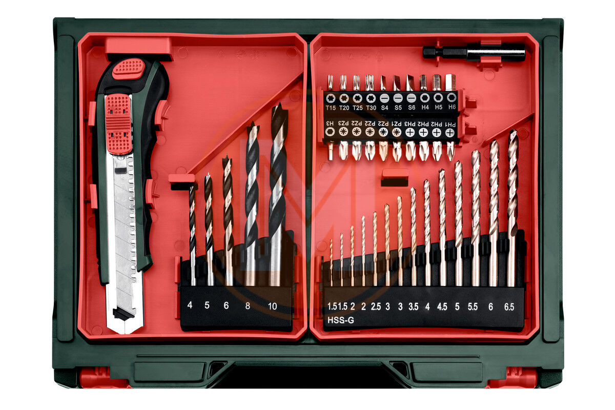 - Mobiele werkplaats (41-delig): 5 houtboren (4/5/6/8/10 mm), 14 HSS-boren (1,5/1,5/2/2/2,5/3/3/3,5/4/4,5/5/5,5/6/6,5 mm), 20 doppen van 25 mm (PH1/PH2/PH2/PH3/PZ1/PZ2/PZ2/PZ2/PZ3/H3/H4/H5/H6/T