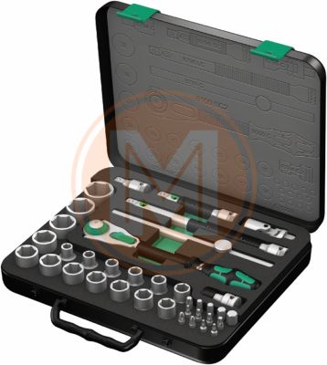 1 Zyklop-ratel met 1/2"-aandrijving, 17 Zyklop-doppen (metrisch)2 Zyklop-verlengstukken (kort en lang) met vrijloophuls en Flexible-Lock-Systeem,1 Wobble verlengstuk, 1 T-grip, 1 cardangewricht, 1 bithouder met snelwisselfunctie, 13 bits